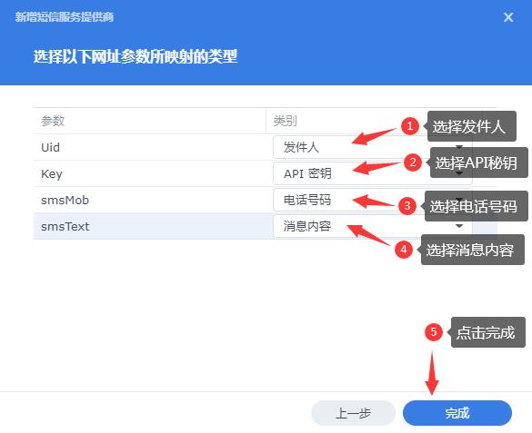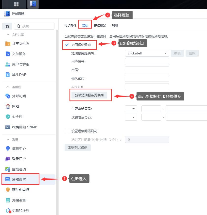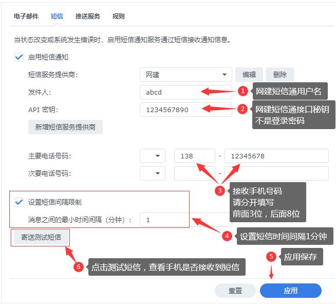 設置完成后,點測試短信,手機收到 “Test Message from ****** ” 就代表測試成功。***是您群暉設備的名稱。
